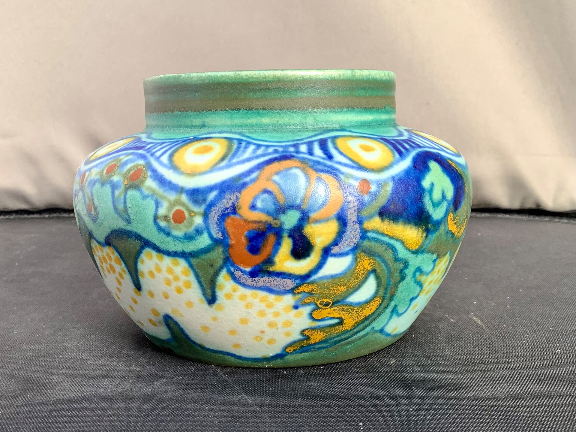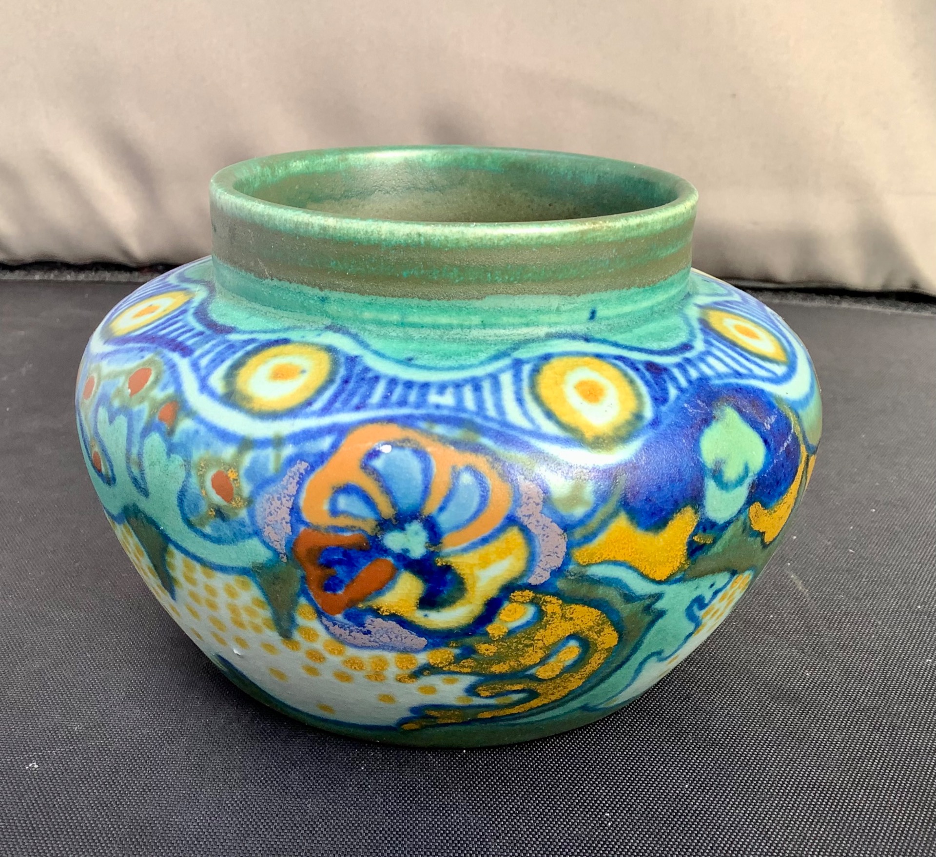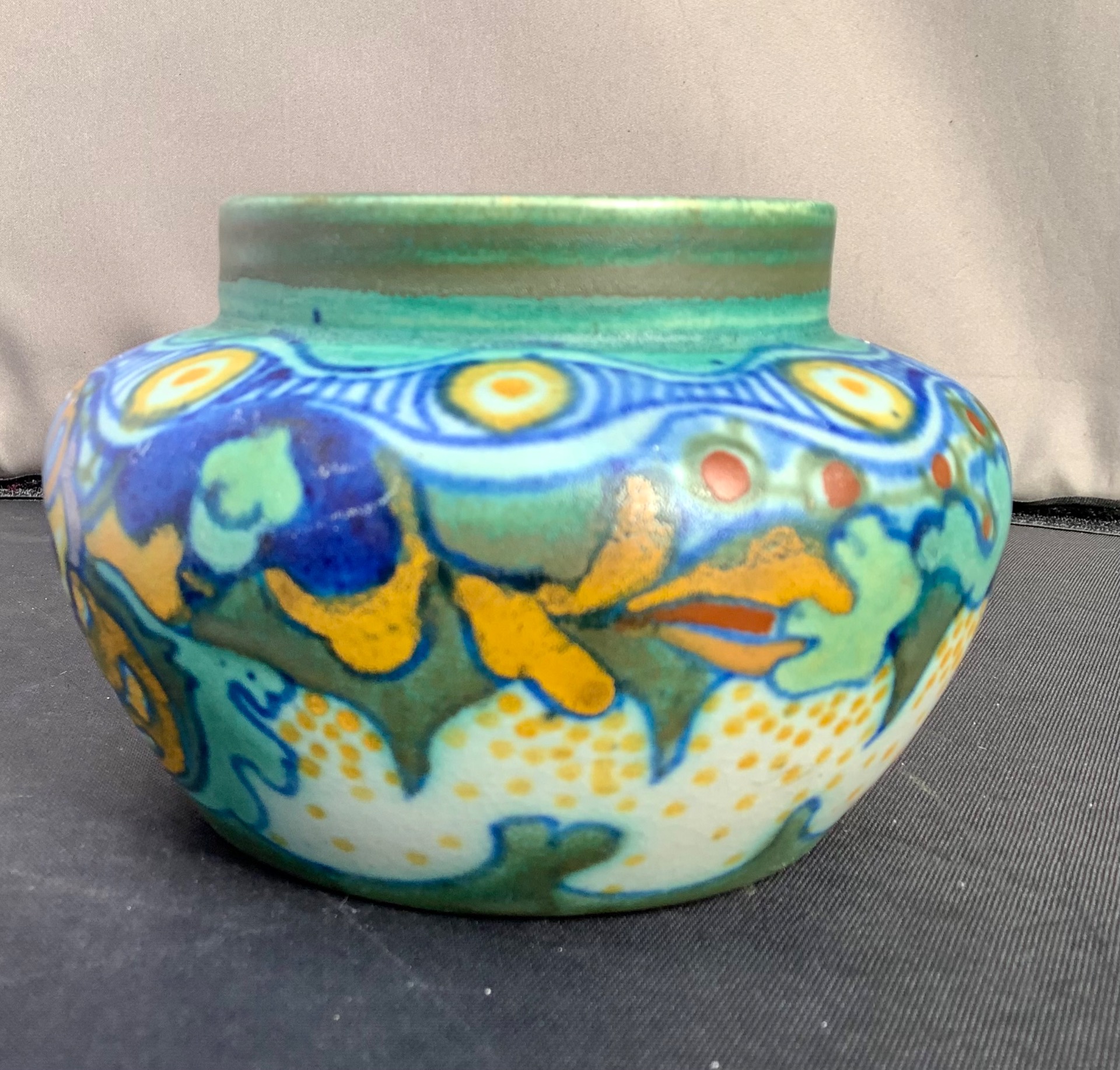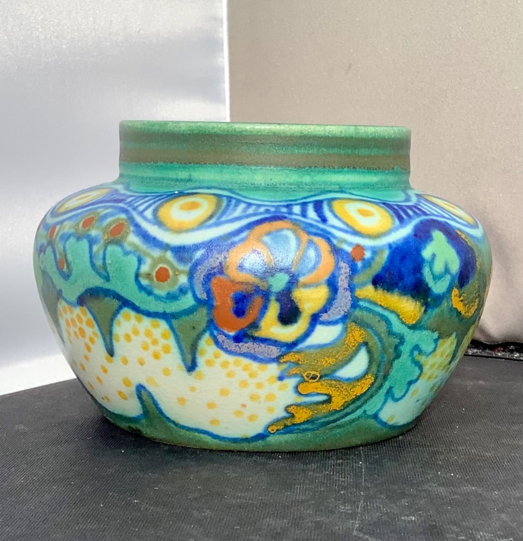 Mooi kleurrijk aardewerk vaasje decor Corona uitgevoerd bij Plateelbakkerij Zuid-Holland Gouda ca 1920.