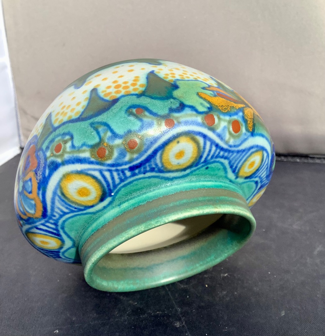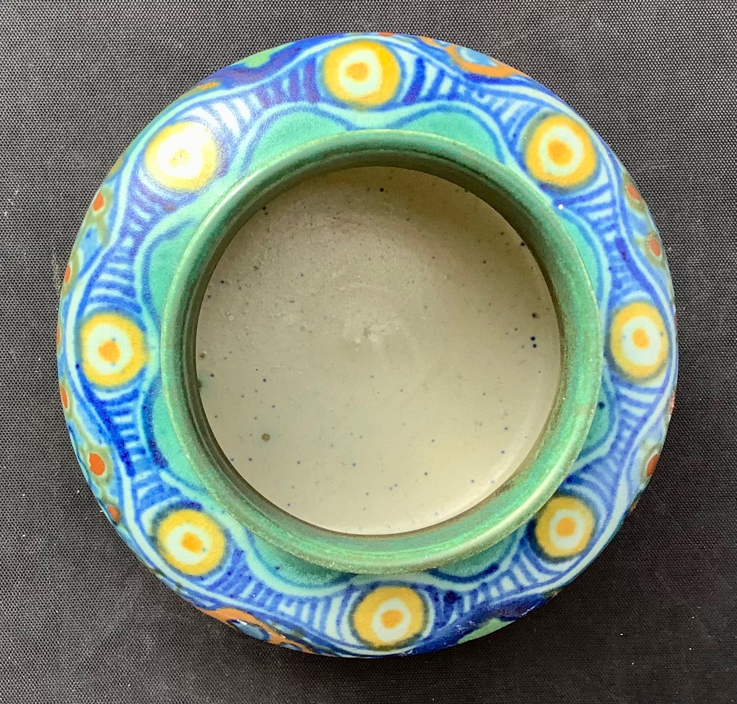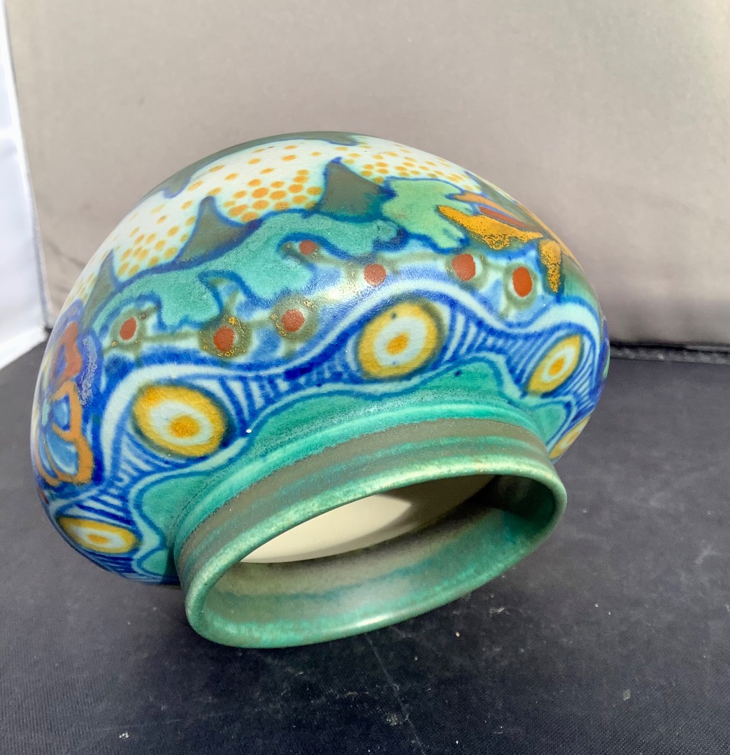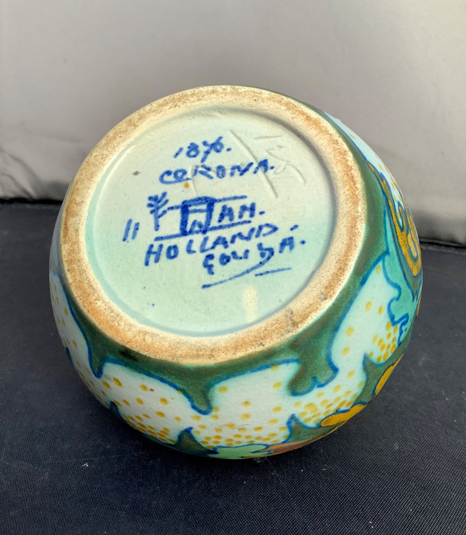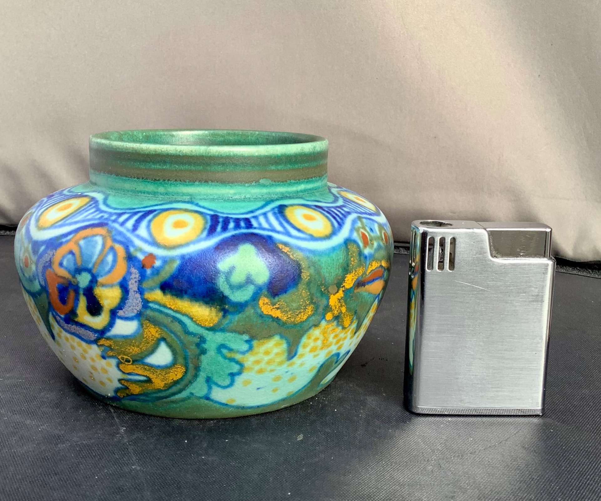 Mooi kleurrijk aardewerk vaasje decor Corona uitgevoerd bij Plateelbakkerij Zuid-Holland Gouda ca 1920.