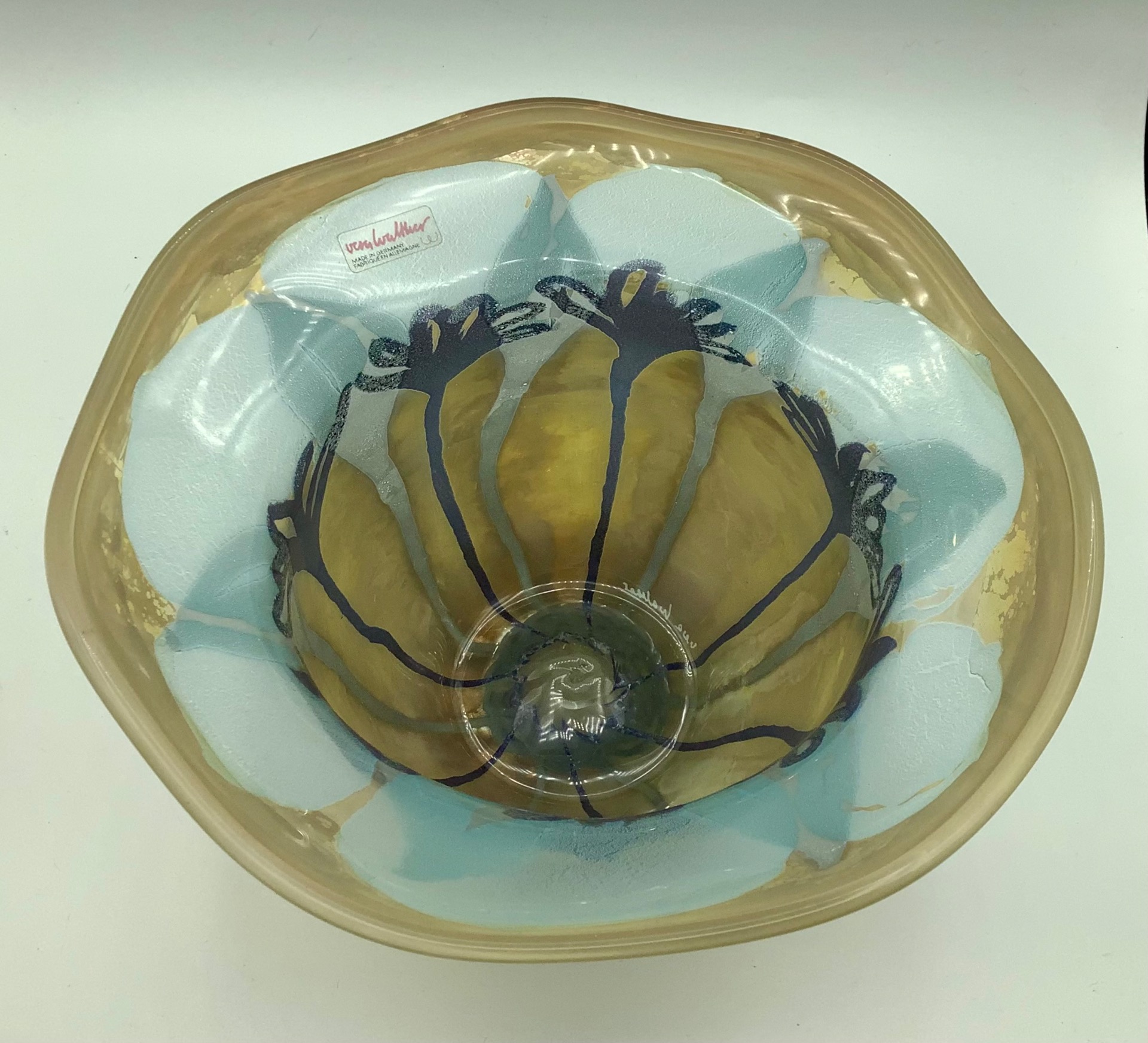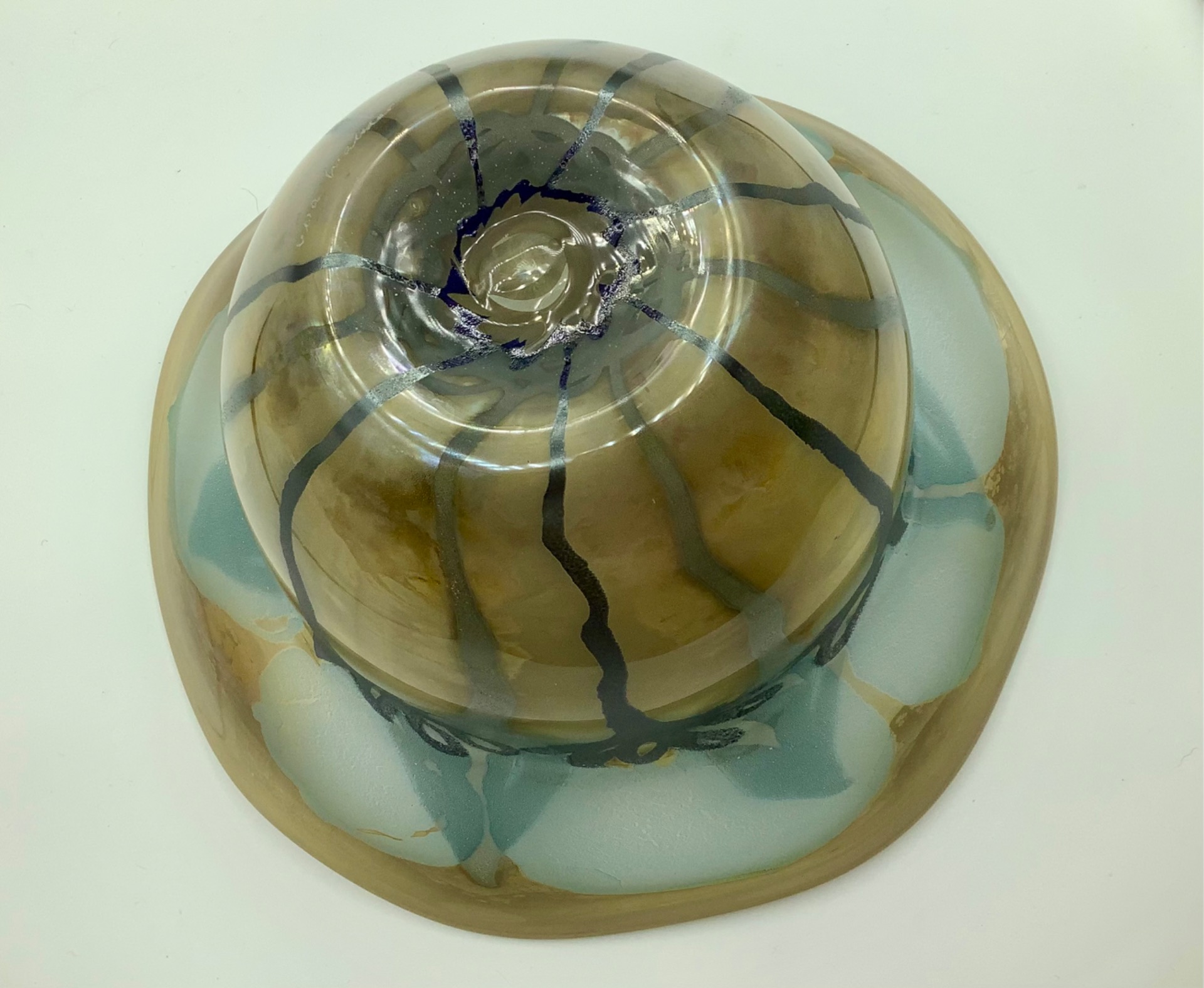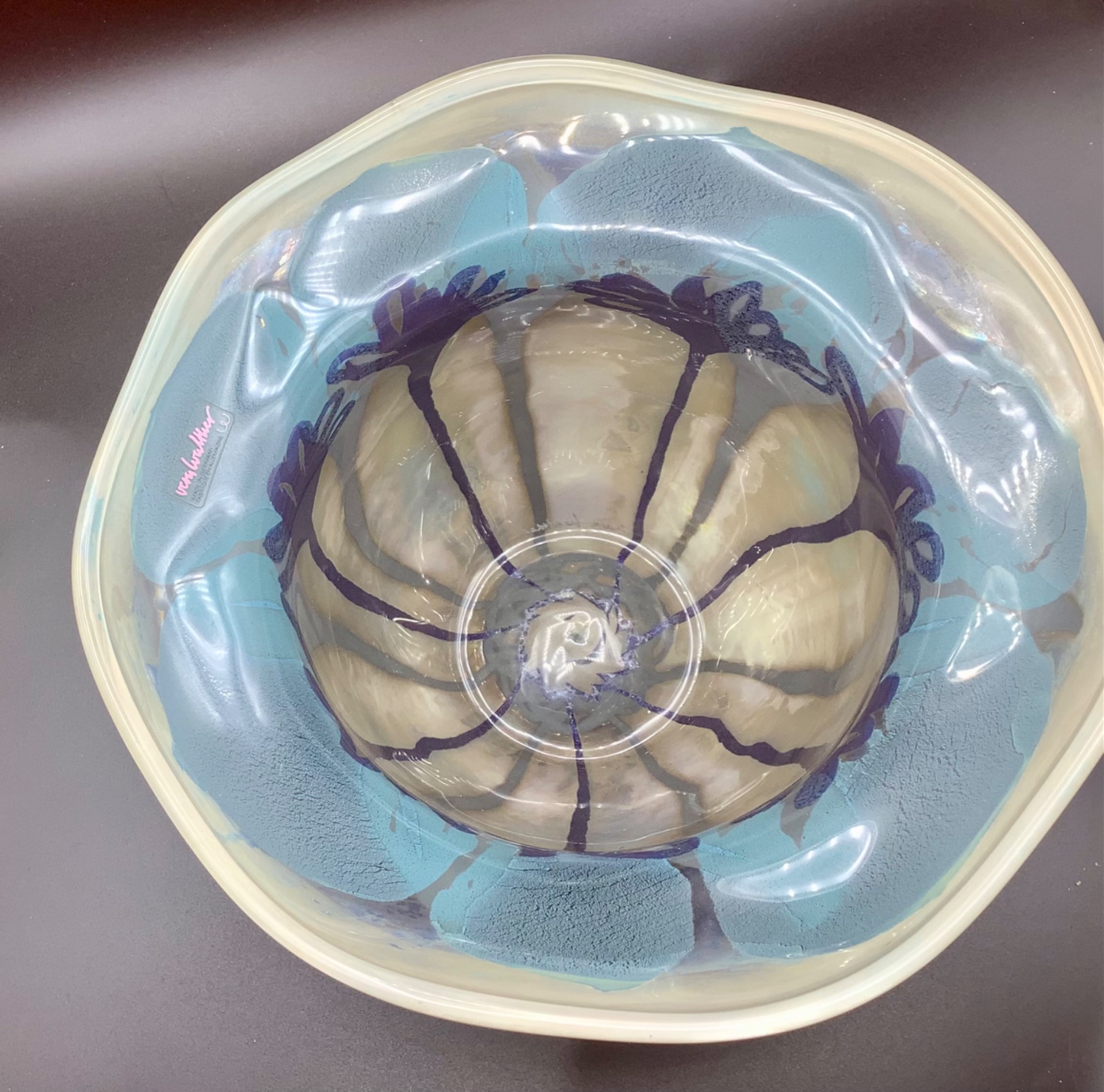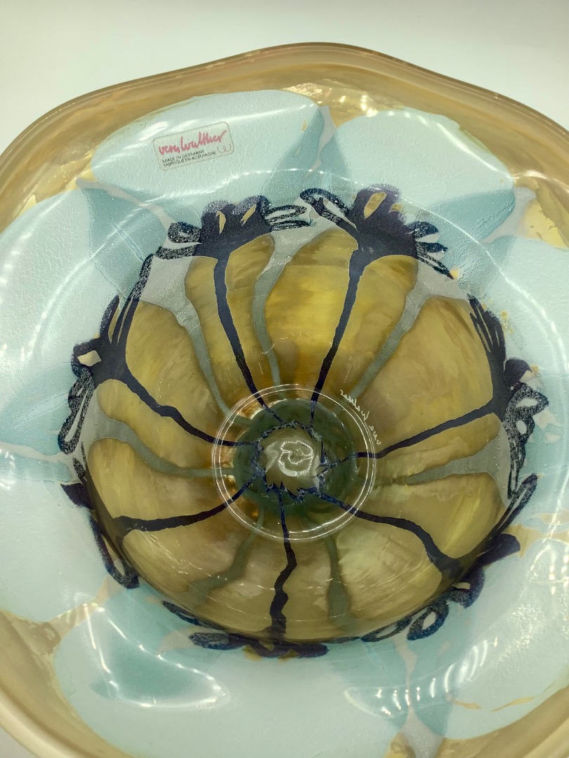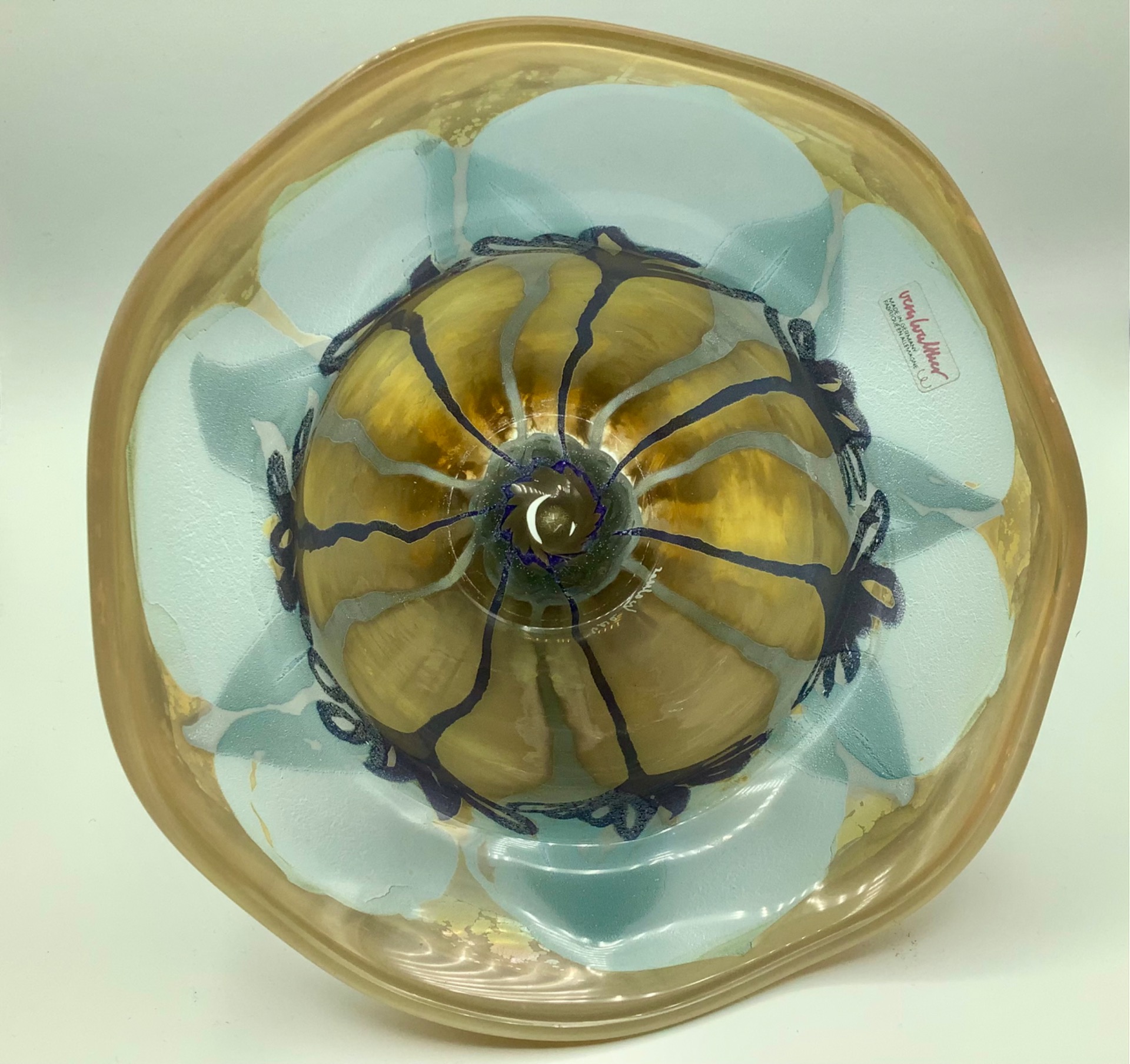 Heel dun met de mond geblazen wijd uitlopende schaal met hand beschilderde