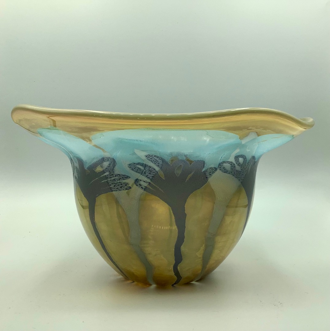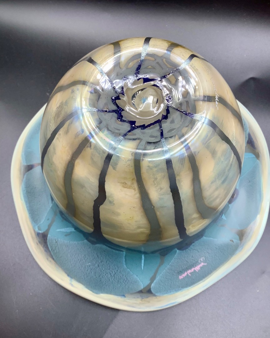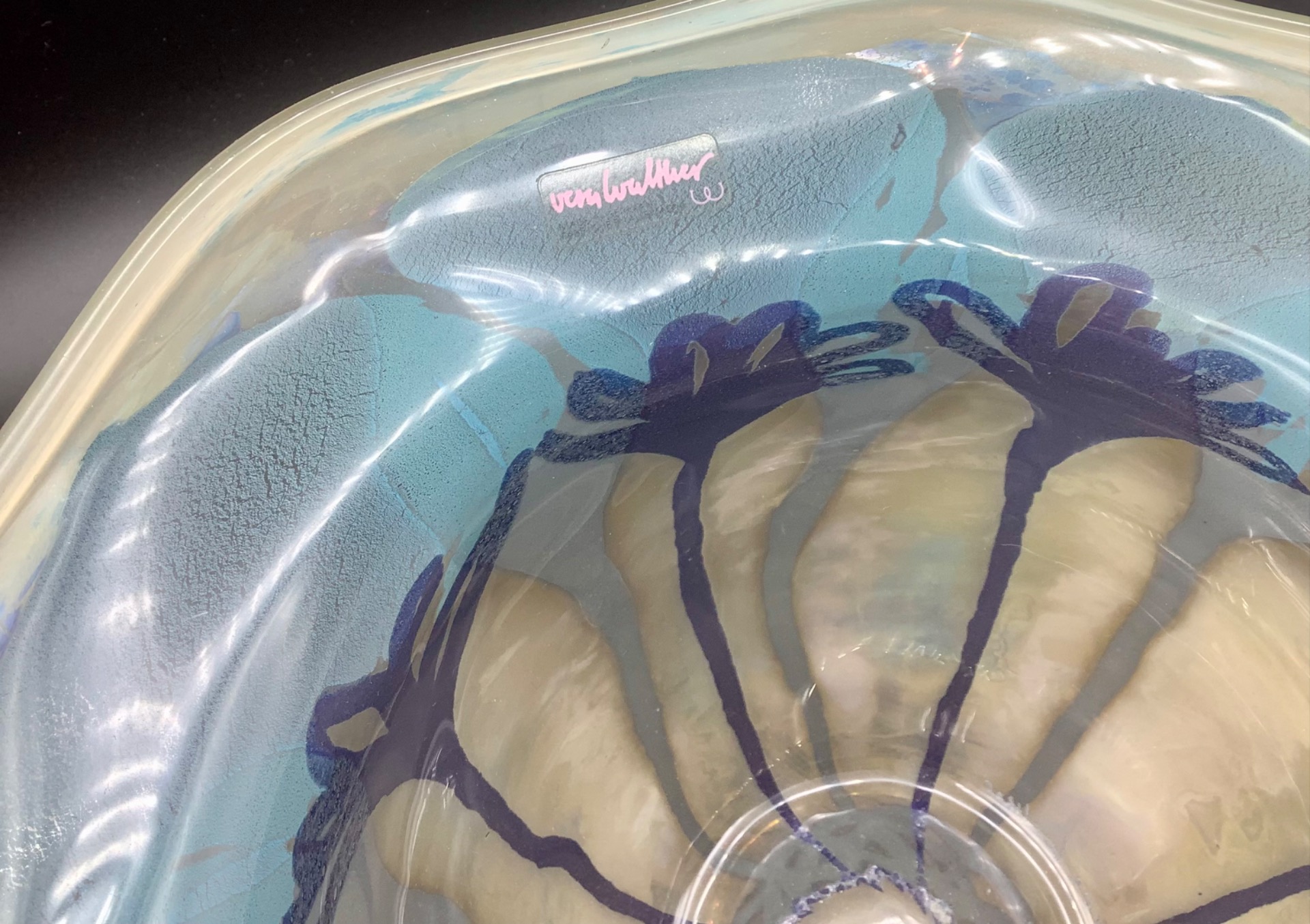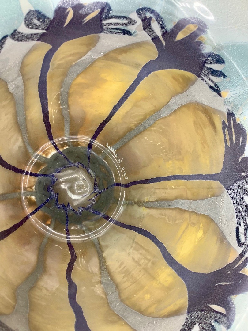Heel dun met de mond geblazen wijd uitlopende schaal met hand beschilderde