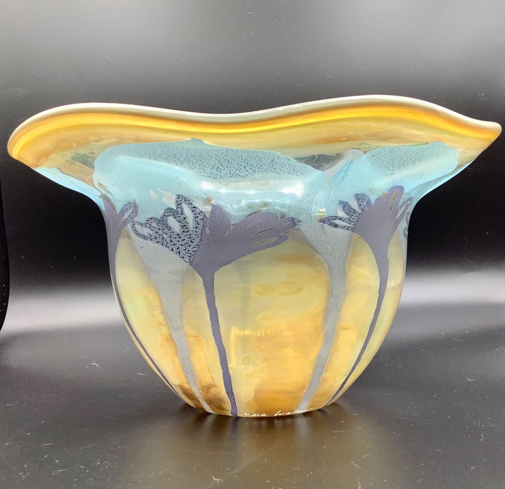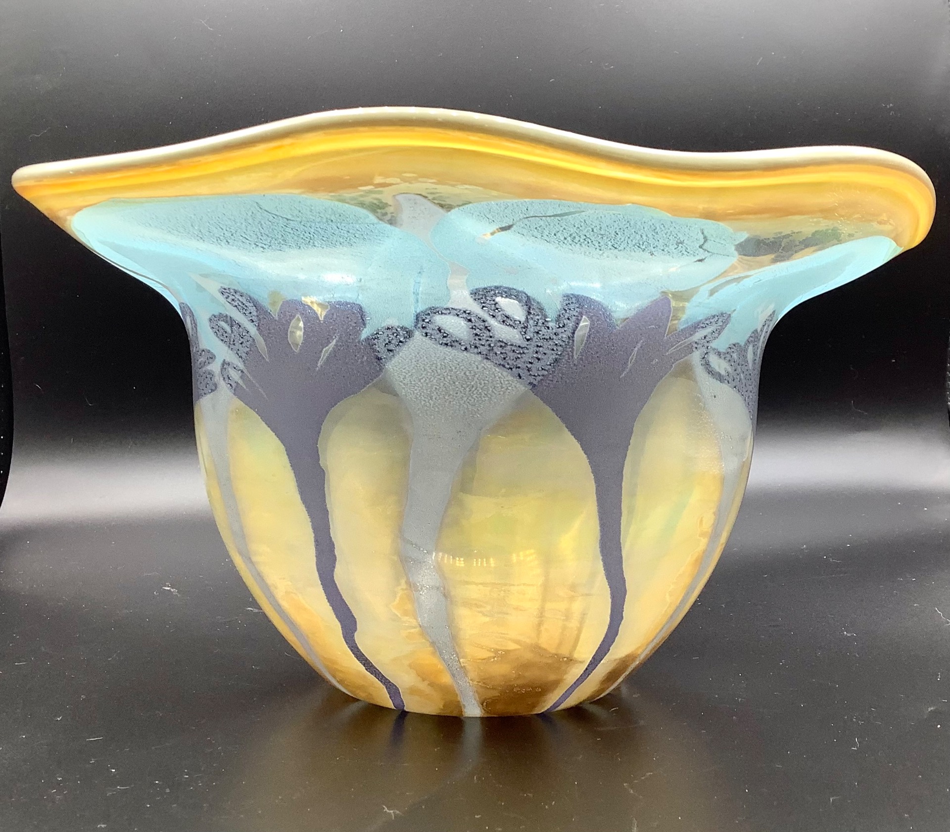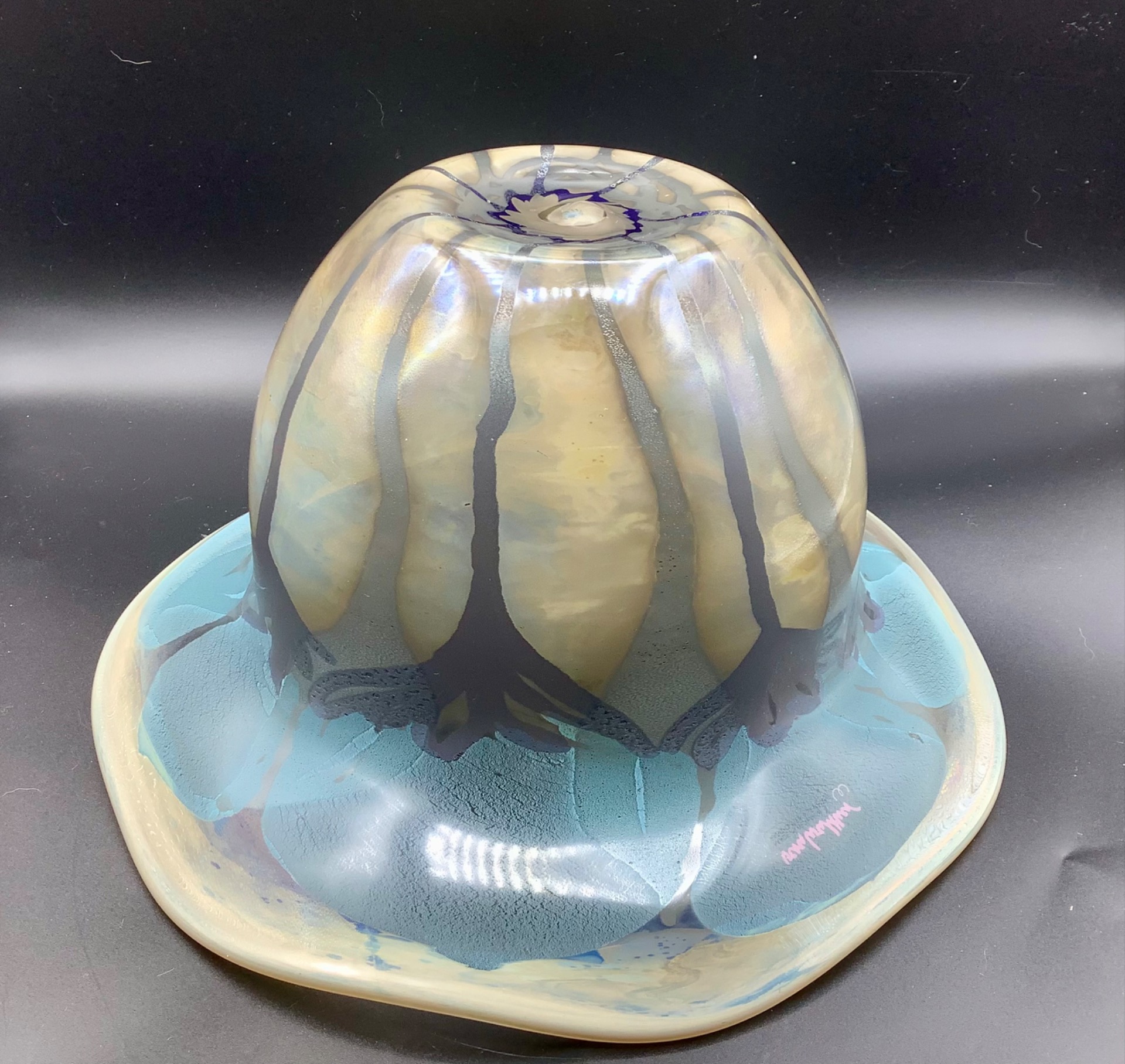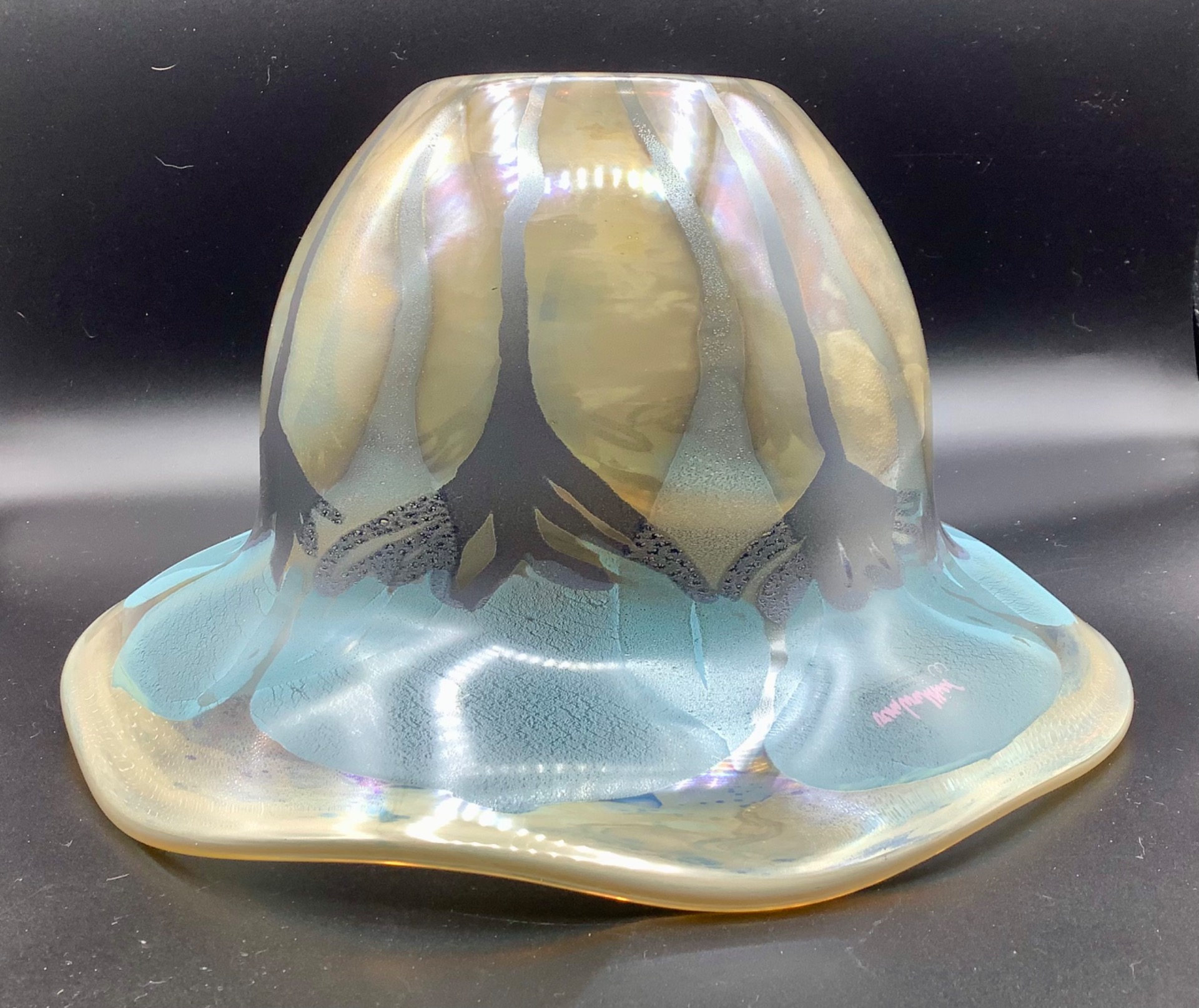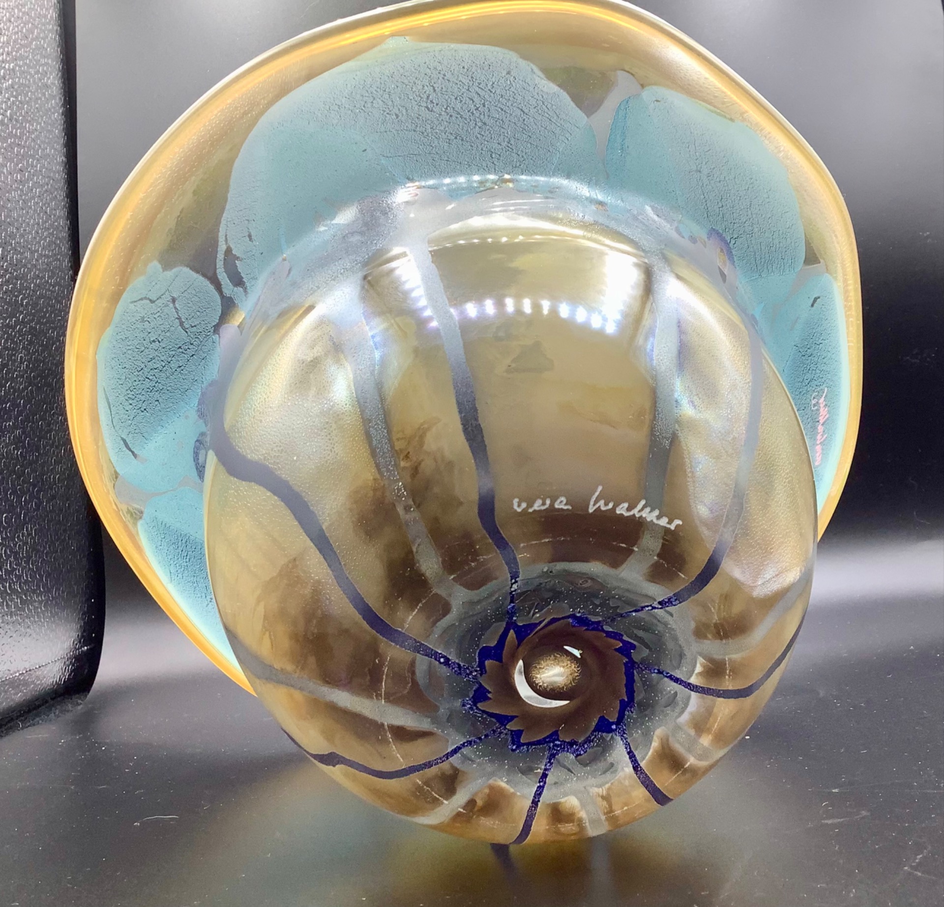 Heel dun met de mond geblazen wijd uitlopende schaal met hand beschilderde