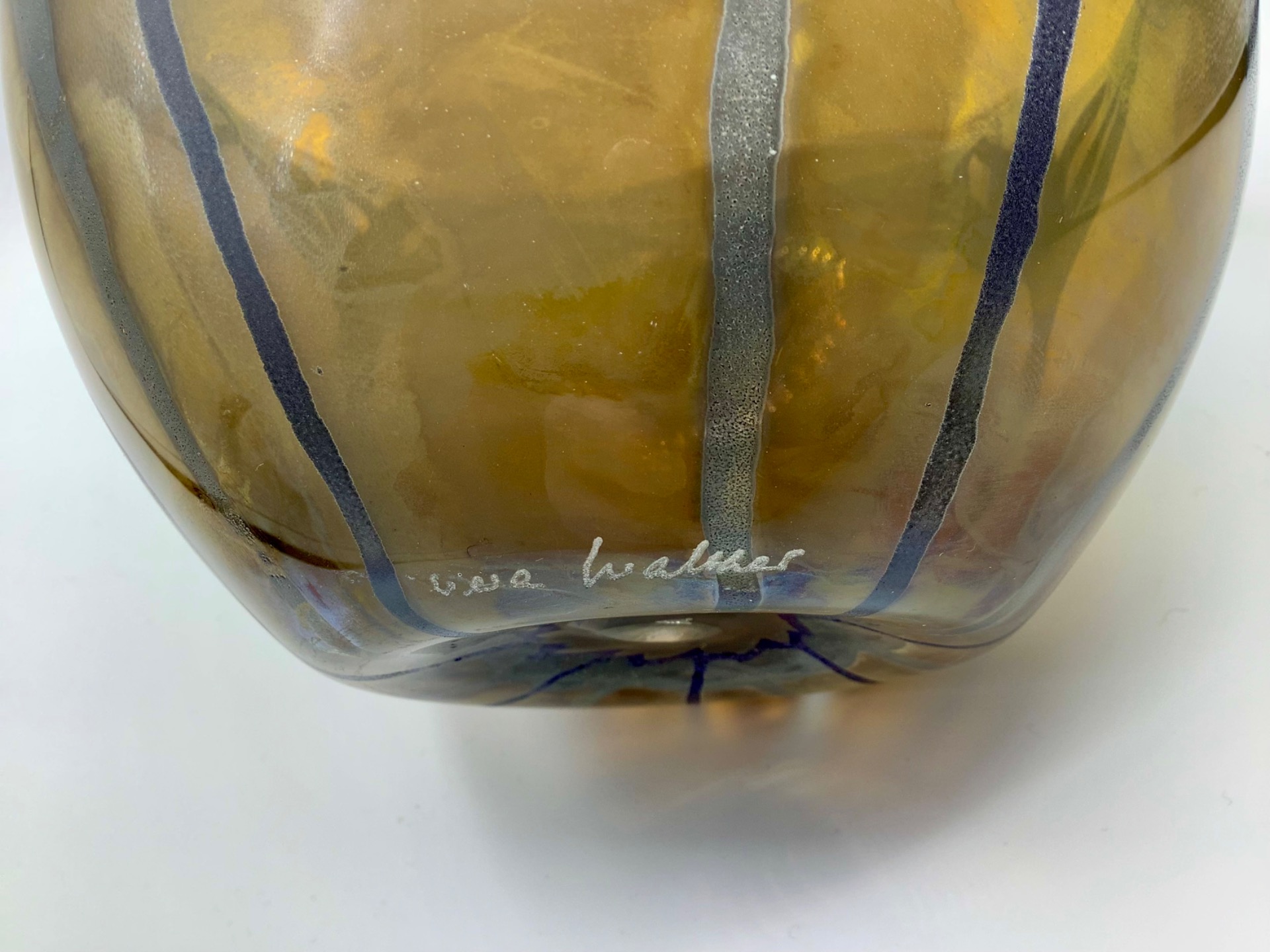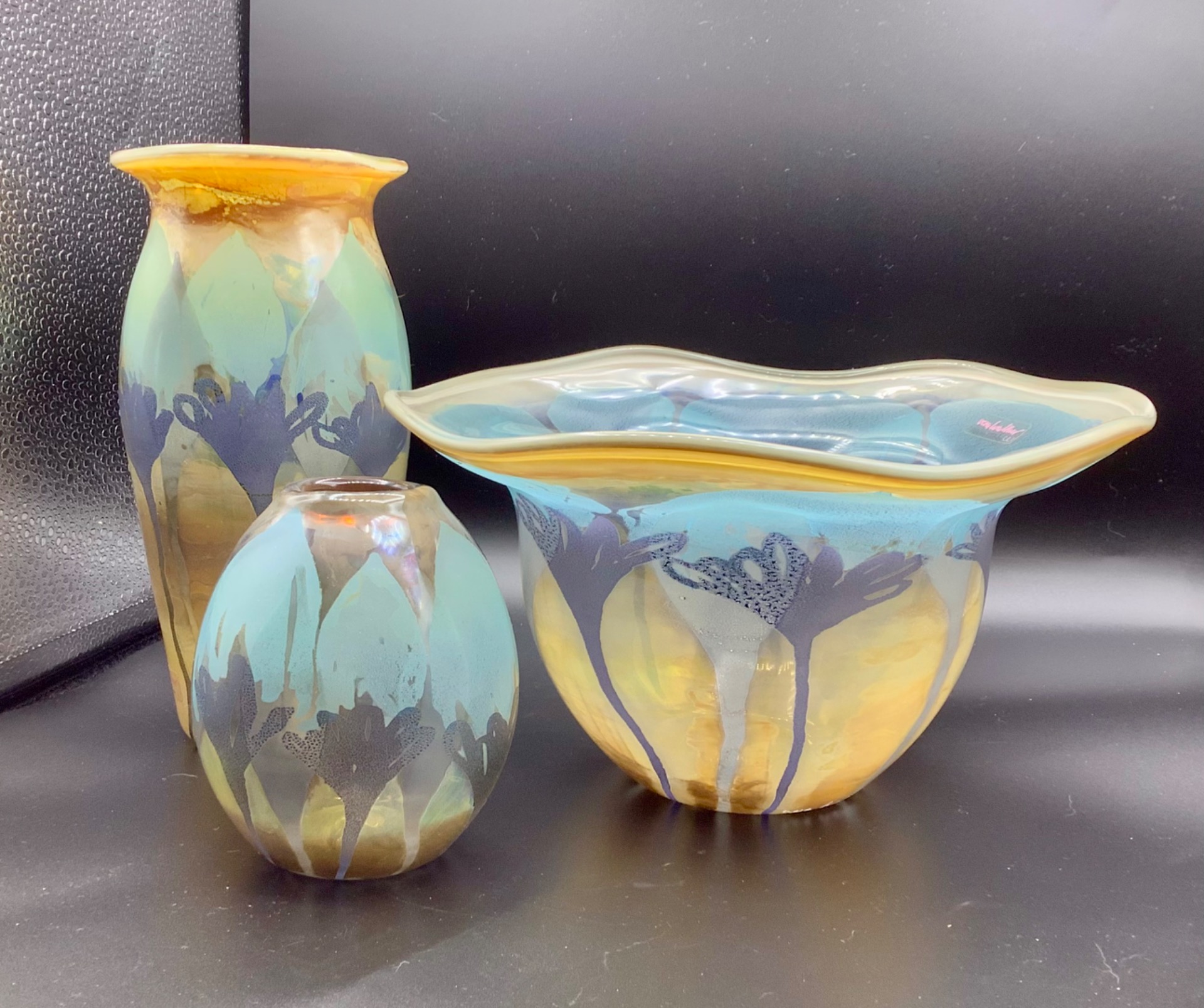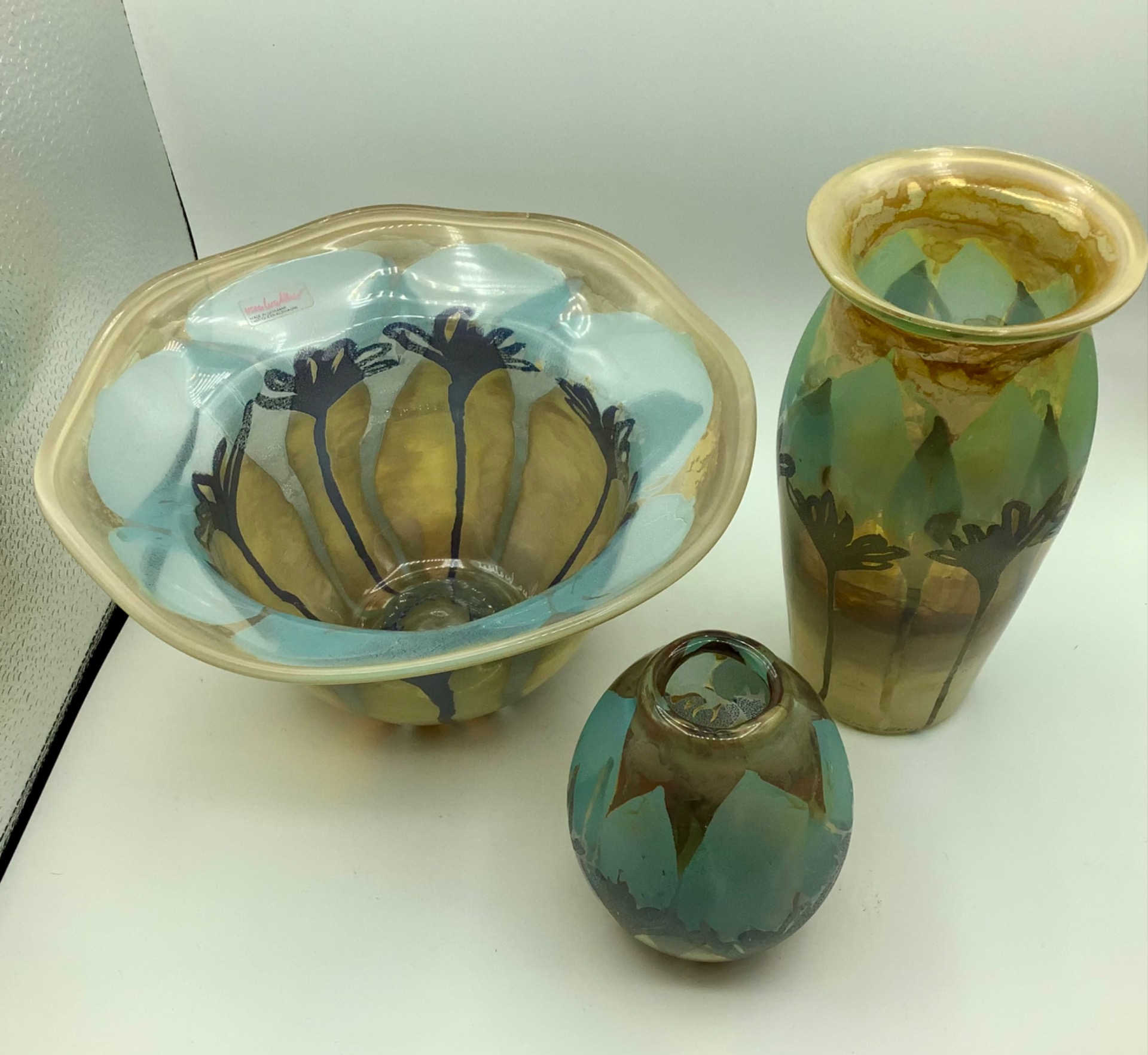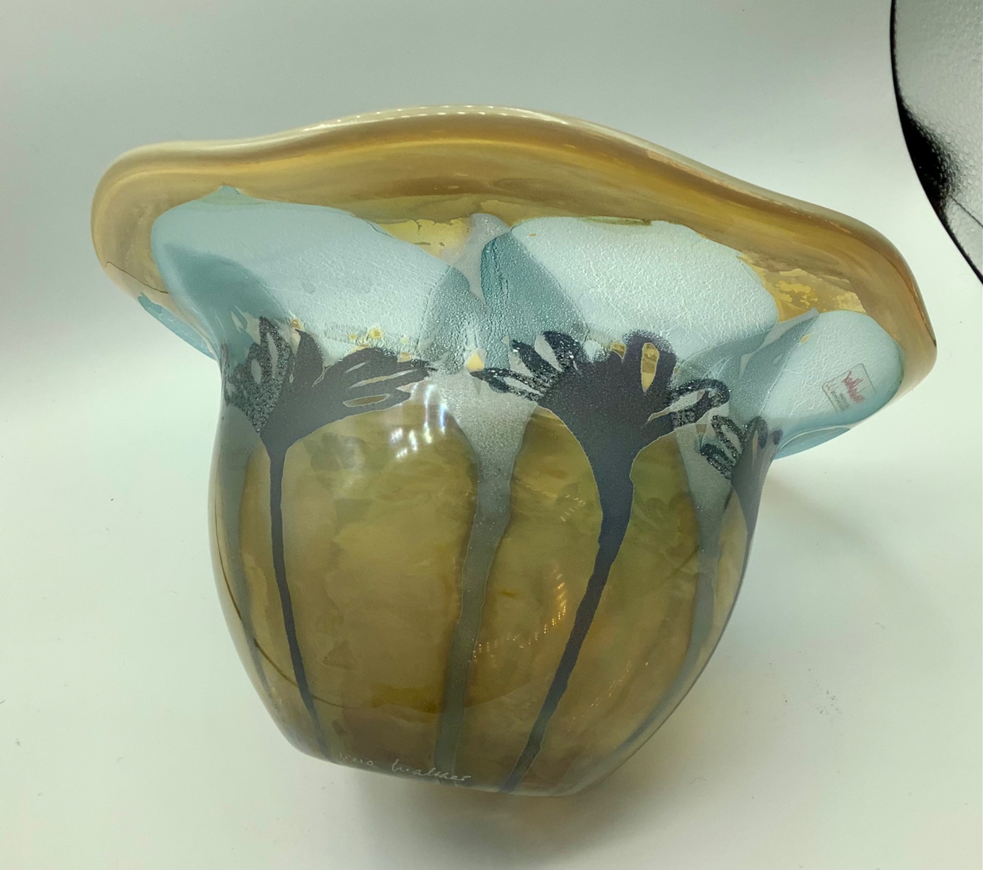 Heel dun met de mond geblazen wijd uitlopende schaal met hand beschilderde