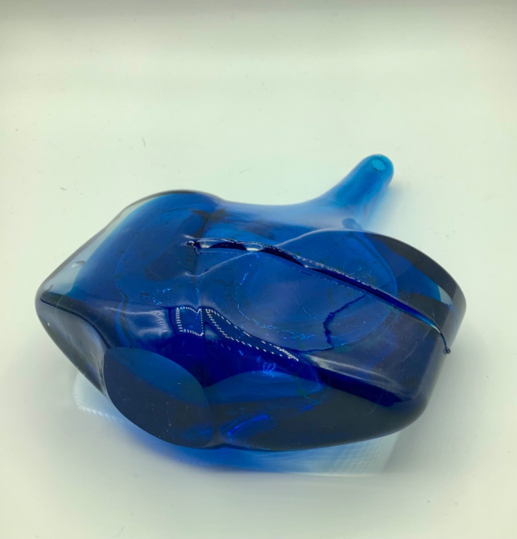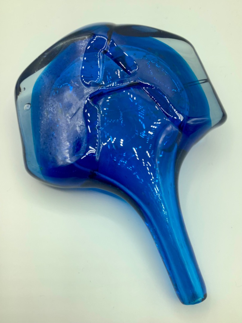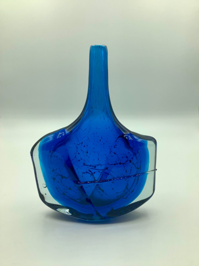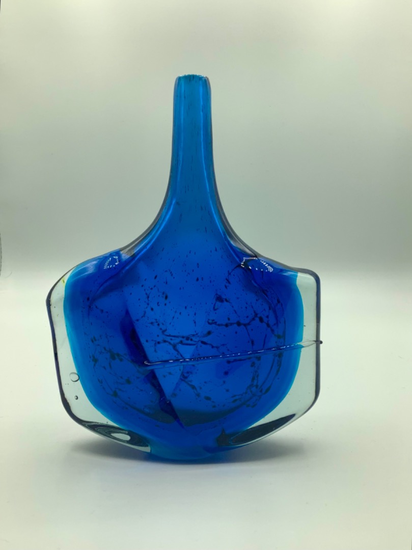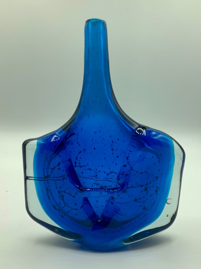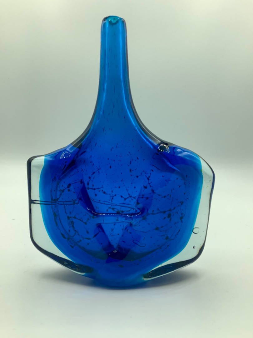 Helder glas met blauw en zwarte insluitingen in een bijl vormig model of