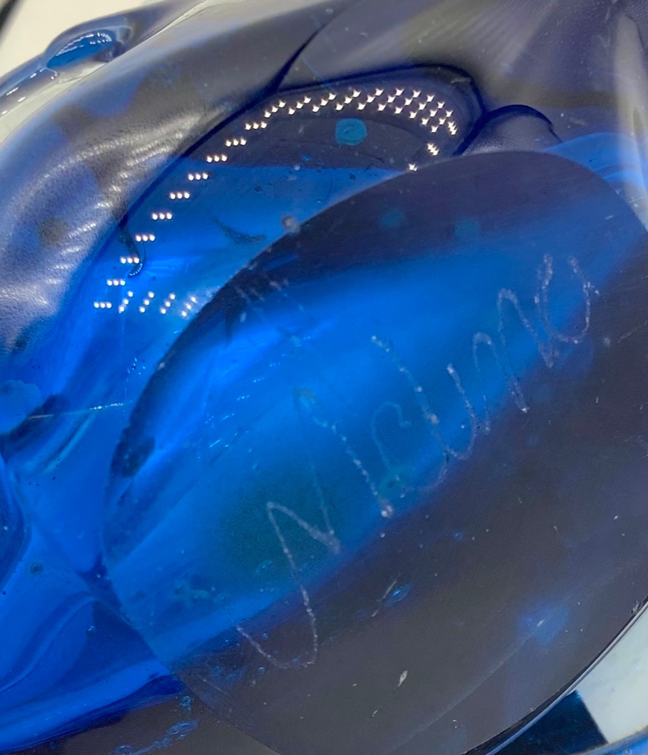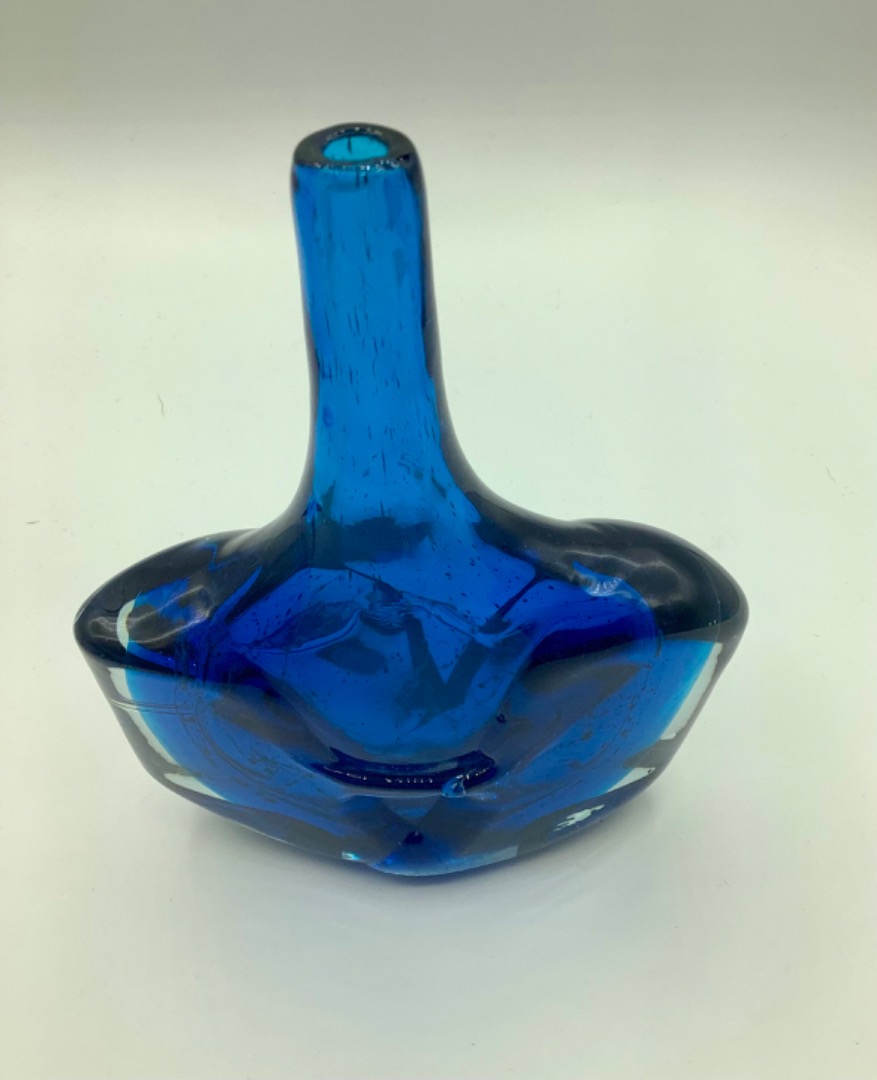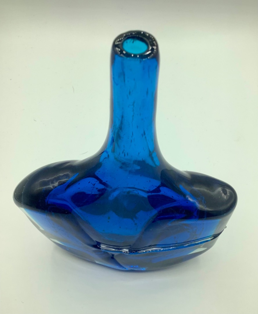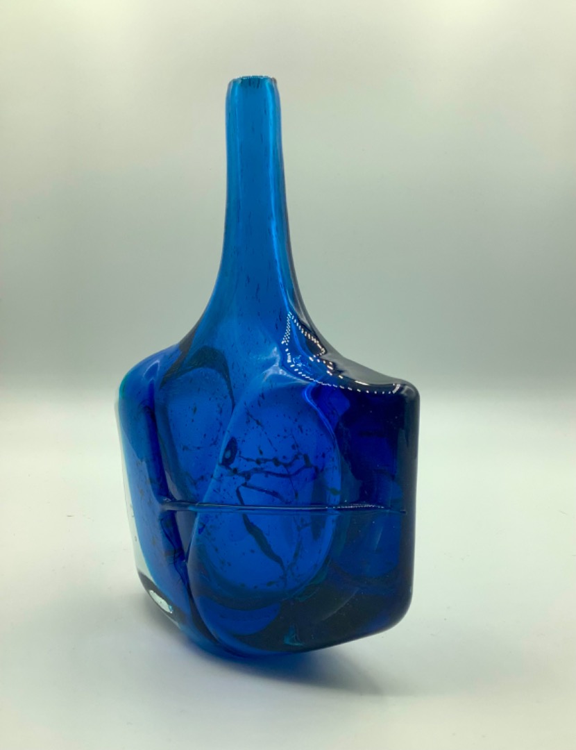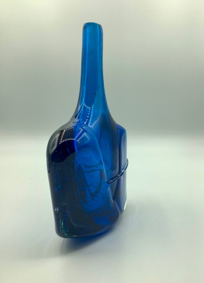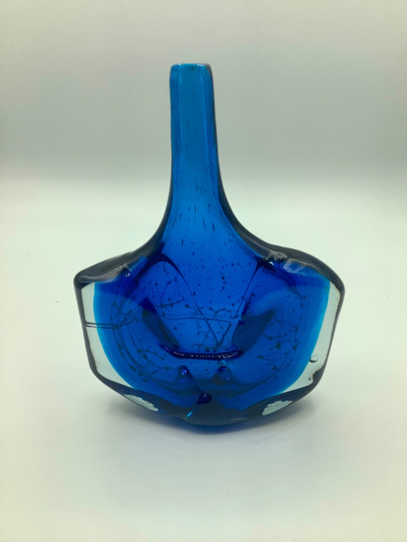 Helder glas met blauw en zwarte insluitingen in een bijl vormig model of