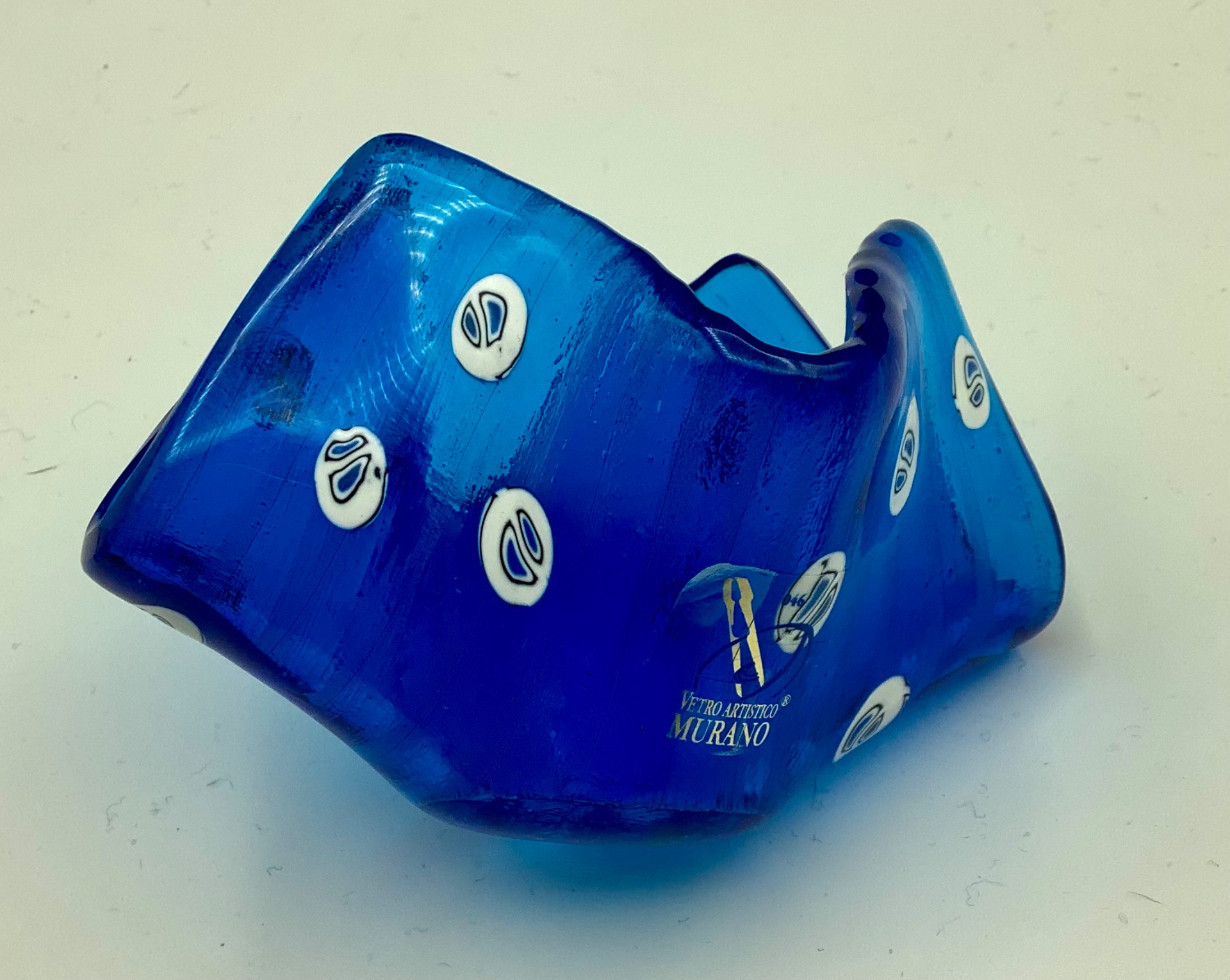 Een kunstwerkje van een mooie kleur blauw glas met aparte blauw witte